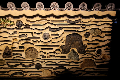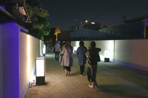 | 妙楽寺にある博多塀のライトアップ。 |