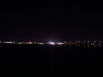 | 長崎空港から見た大村市街。派手さはないですが、空港独特 の雰囲気と海に浮かぶ島なので気持ちいい潮風を受けながら 楽しむことができます。右側の明かりは箕島大橋です。 |