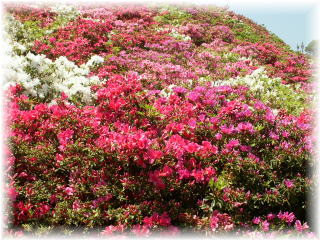 | 長串山に咲いているツツジ。5月上旬までが見頃で す。大きい蜂がたくさん飛んでいたのでちょっと怖か ったです。 |