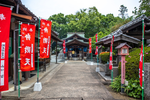 | 福岡市東区名島にある天台宗の寺院・宗栄寺は御本尊が薬師瑠璃光如来・別本尊として弁財天が安置祀られている寺院で、徳川三代将軍の時代に天草で農民一揆が起こった際に、黒田藩黒田忠之を将として一万石を領していた岡田半左衛門利良とその子佐右衛門が敵の銃丸により戦死し、利良の妻が父子の遺品を名島の古塁の麓に納めて精舎を建て、比叡山で修行していた心性坊俊道を招き開基としたのが始まりとされています。 現在の場所には弁財天社の神宮寺の末社があったのですが、明治初年の神仏分離令により弁財天社は名島神社となり、祀られていた弁財天は転々としたのですが名島地区民の強い要請と運動により明治7年1月名島へ還御し宗栄寺が別当寺となり現在に至り、祀られている弁財天は平安時代の慈覚大師円仁が、唐より帰朝の折弁財天に祈願して無事帰国できたことを感謝して勧請したものと伝えられています。境内には弁財天の使いとされている信者から奉納された沢山の蛇の像があります。 境内は鳥居の先に寺があるという神仏習合の雰囲気があるもので、60日に1度来る己巳の日は弁財天の御縁日であり、宗栄寺では護摩焚き等のお祀りが行われて沢山の参拝客で賑わいます。 御本尊:薬師瑠璃光如来 別本尊:弁財天 |