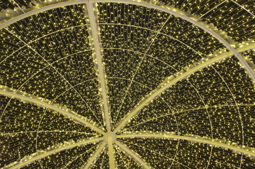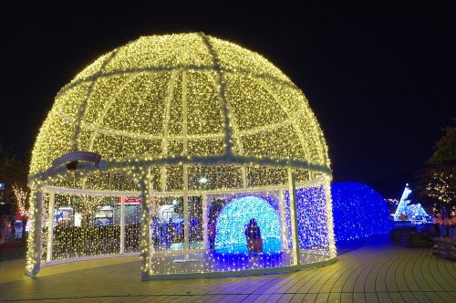 | 中間市のやすらぎ通り・ダイエー前広場に、13万球のLED電球を使った中間市のイルミネーション「中間やすらぎイルミネーション」が2012年1月15日まで開催されています。主なイルミネーションは高さ約6m・直径8mのドーム、幅6m・長さ20mのトンネル、高さ8mのツリーになります。 |