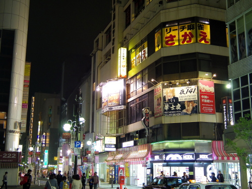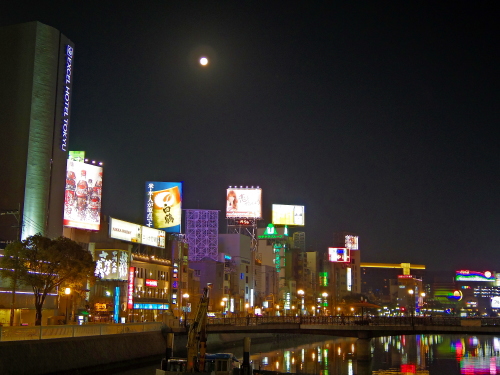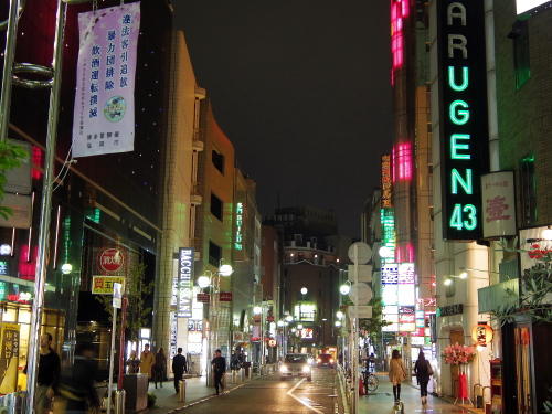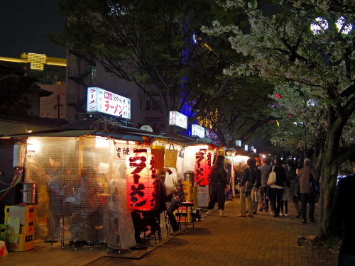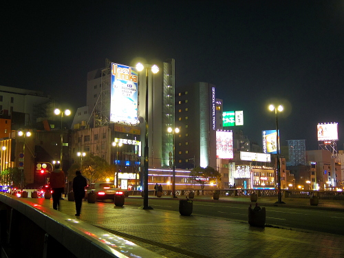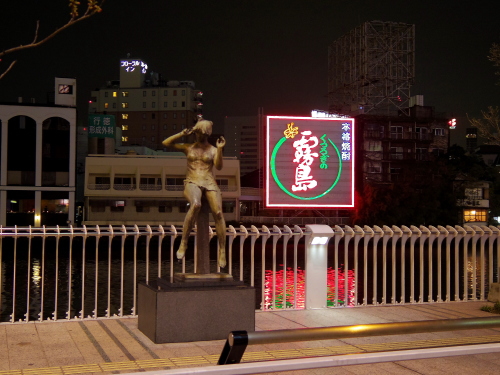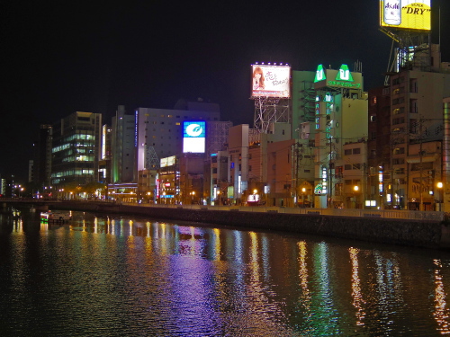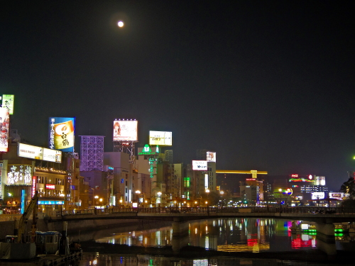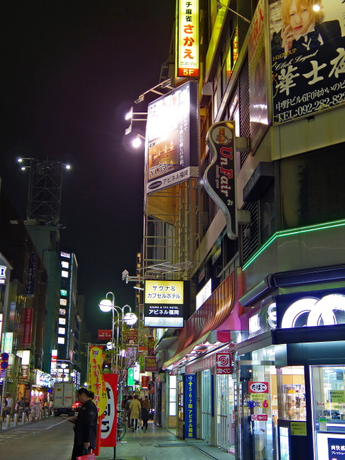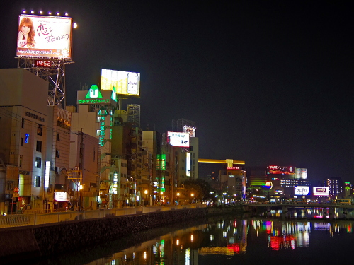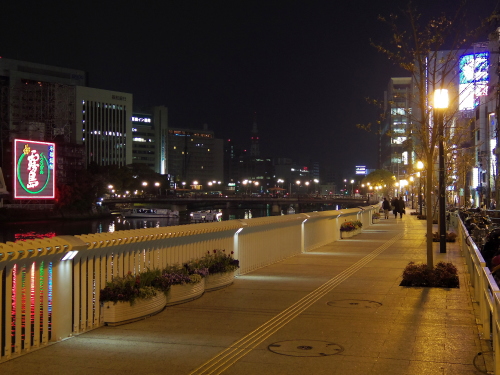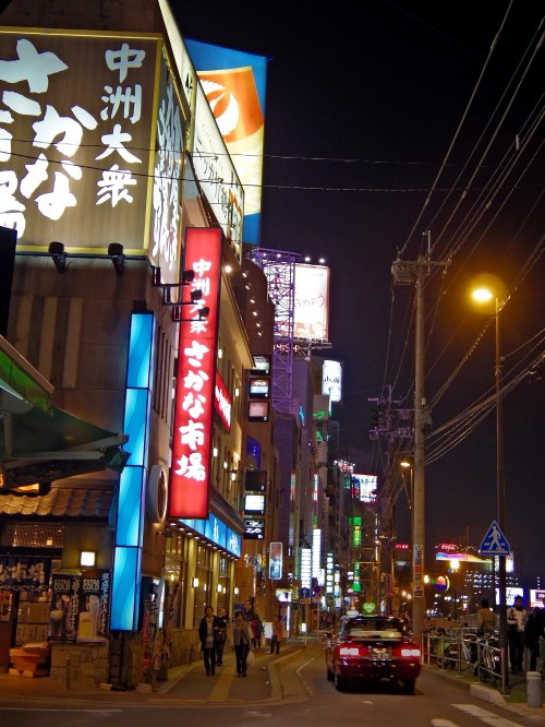 | 九州一の歓楽街として有名な中洲は、ネオンが点灯して賑やかな雰囲気を持つ有数の歓楽街です。この中洲のネオン街と那珂川の夜の光景は、博多らしい光景と思います。特にベストポイントは西大橋から眺めるのが一番いいです。他に福博であい橋からも中洲の夜景を観賞できます。 中洲大通りは週末になるとサラリーマンや観光客でにぎわいます。 |
