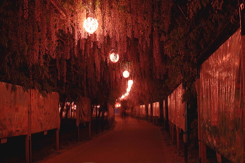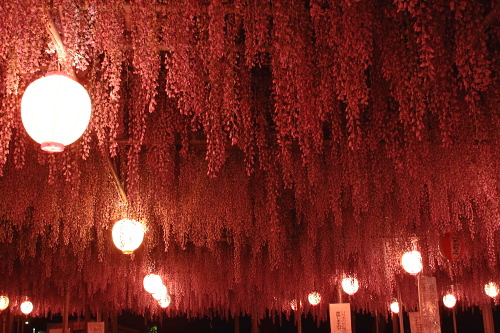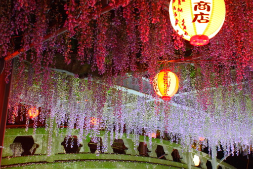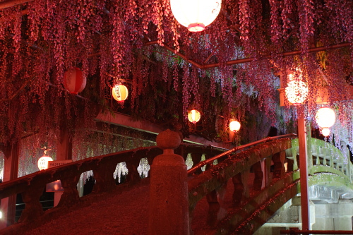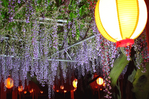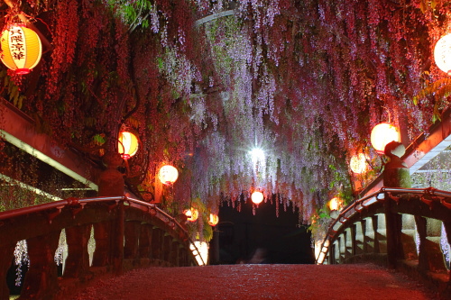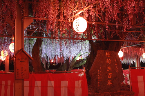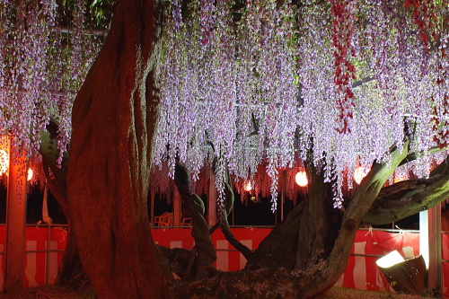 柳川市三橋町中山には、樹齢約300年になる福岡県指定天然記念物である「中山の大藤」が4月下旬頃から綺麗に咲き誇ります。享保年間に大阪の野田の藤を持ち帰り植えたのが起源となっており、熊野神社境内には約350坪の棚があり毎年130cmの花が咲きます。夜間にはライトアップも行われ、昼間とは違った藤を観賞する事が出来ます。