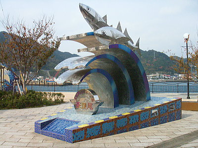 奈良尾港ターミナル前にある魚と波をかたどった金属製のモ