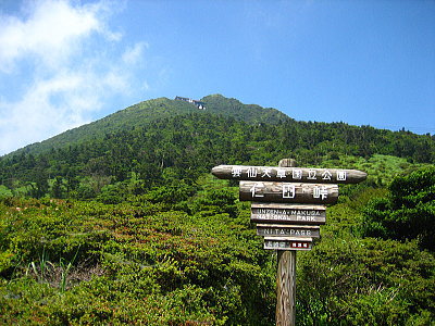 | 雲仙天草国立公園・仁田峠の看板と妙見岳。 |