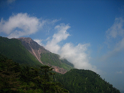 | 仁田峠途中にある展望台から見た雲仙普賢岳。火砕流のつめ跡がはっきりわかります。 |