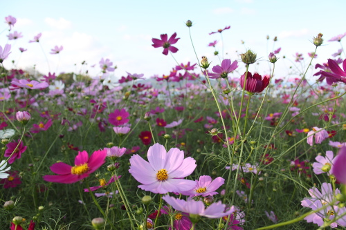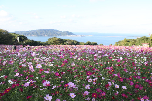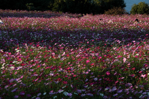 | 芝の広場に併設されている花畑。コスモスが一面に咲いてます。 |