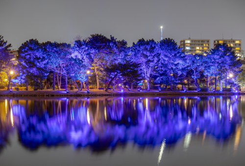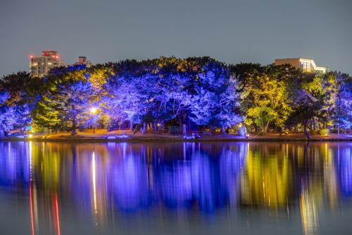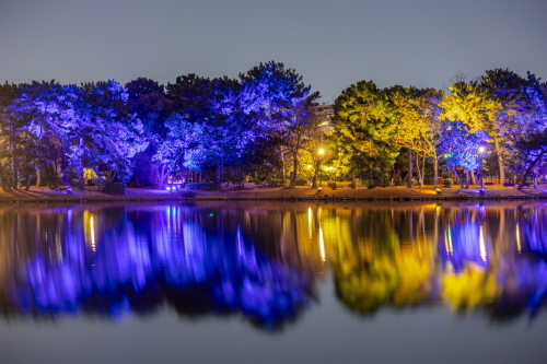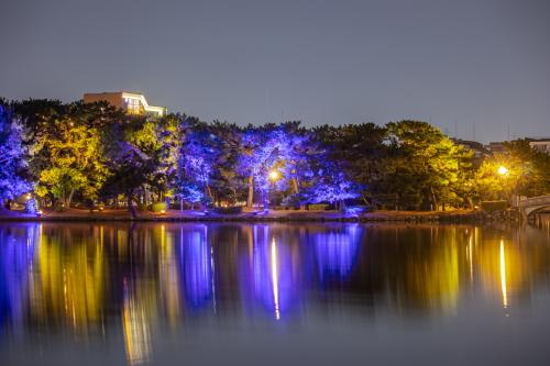 | 大濠公園は福岡市中央区にある福岡県営の都市型公園で国の登録記念物になっており、ジョギングやウォーキングなどで賑わう福岡市民に愛されている公園でもあります。夜間になると大濠池に浮かぶ中の島は74基のLED照明で22時までライトアップされ、治安向上と水面に反射する「水鏡」の幻想的な風景が楽しめるようになっています。 2022年3月1日、福岡県議会は直ちに 「ロシアのウクライナ侵攻に強く抗議し、恒久平和を求める」 決議を採択しました。福岡県はこの決議に深い敬意を表し、ウクライナと平和を求めるすべての人々との連帯を示すため、ウクライナ国旗の色である青と黄色で大濠公園の大濠池に浮かぶ中の島にライトアップが行われます。 ライトアップ期間:2022年3月9日から暫くの間 ライトアップ時間:日没〜22:00 駐車場:有料駐車場有 |