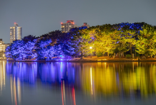 大濠公園 ウクライナ国旗 ライトアップ(福岡市)