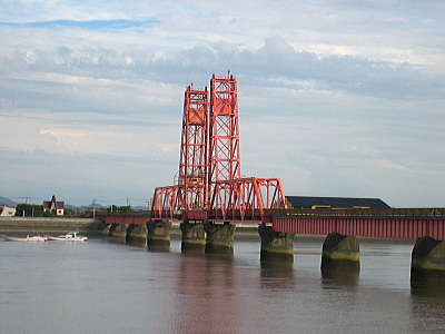 | 福岡県と佐賀県の県境に流れる筑後川に昇開橋という橋が架かっています。現在はサイクリングロードになっていますが、昔は国鉄佐賀線(佐賀〜高間)が走っていました。列車が走るときは中央が下がって線路をつなぎ、船が橋の下を潜る時は中央があがるという変わった橋です。 |