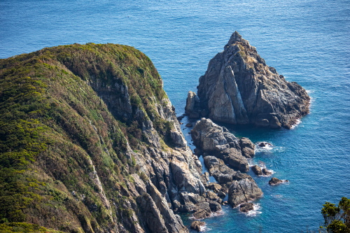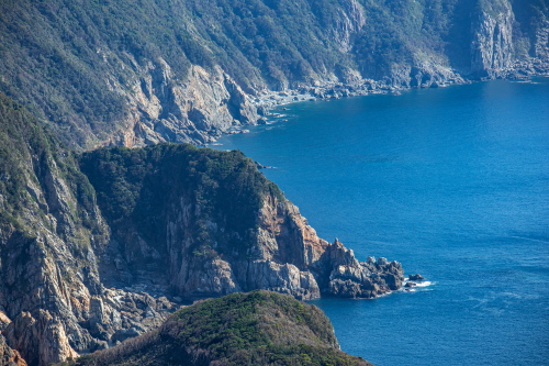 | 遊歩道から断崖絶壁の海岸線を望む。 |