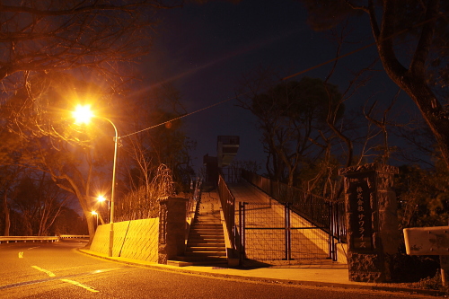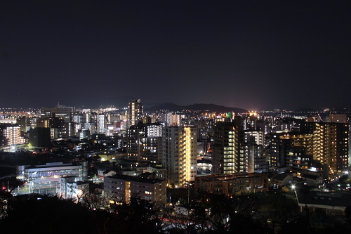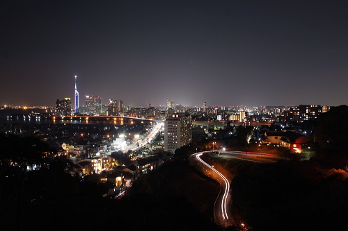 | 福岡市を一望できる愛宕神社の駐車場から反対側に新しくできた展望台がある大山祗神社跡公園は、姪浜炭鉱を経営していた現在の(株)サワライズが創立100周年を記念して造られた公園です。公園にある展望台からは百道方面と姪浜方面の夜景を観賞できるスポットになっています。近くの愛宕神社よりは高度はありませんが、愛宕神社からは眺めまれない姪浜方面の夜景を観賞できます。しかし天神・西新方面の夜景は観賞できません。 |