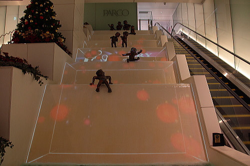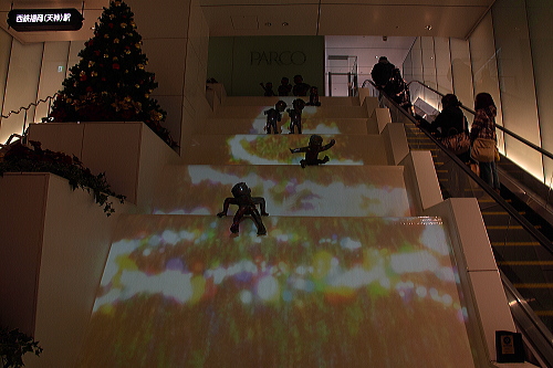 最近オープンした福岡パルコの地下入口にある「天神かっぱの泉」では、クリスマスの時期に10時から23時の間・30分おきに光の映像が投射されます。