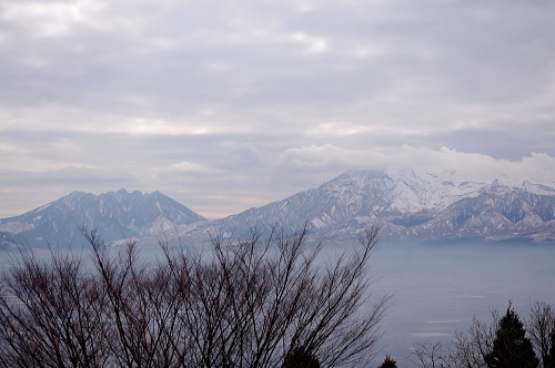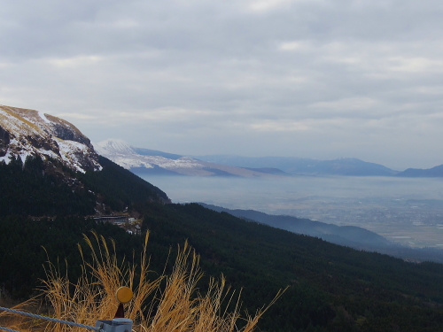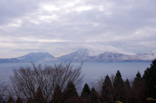 湯浦展望所より雪化粧した阿蘇山を眺める。