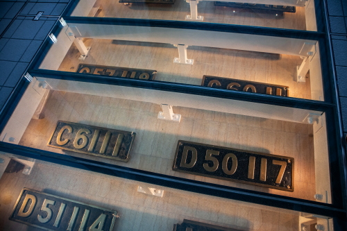 | 鉄道博物館入口の床に埋め込んだ蒸気機関車のプレート。 |