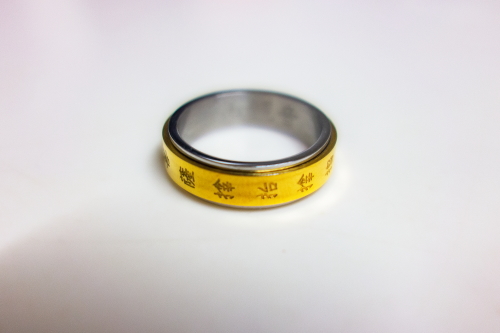 | 雷山千如寺大悲王院で販売されている「サムハラ」「千手観世音菩薩」の文字が刻まれた指輪の御守。 |