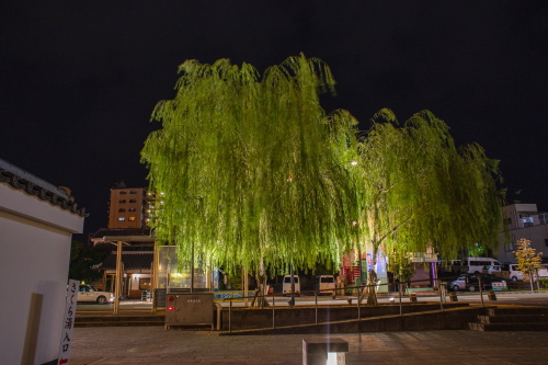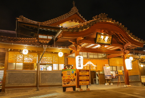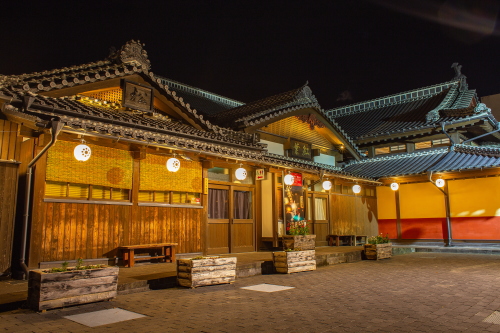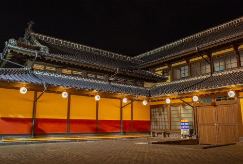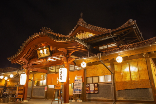 | 山鹿の中心部にあるさくら湯は、約370年前に細川のお殿様が参勤交代で江戸に上がる際、立ち寄った御茶屋として歴史が始まり、明治になると一般大衆浴場として改築改修を繰り返しながら昭和48年に取り壊され、温泉プラザ山鹿としてビル内にオープンしましたが2012年に昔の面影を再現し新たにオープンしました。外観は昭和48年の解体前・内観は昭和33年の大改修前に復元されています。 夜になると、さくら湯に掛けられている提灯等が点灯してライトアップされます。 |