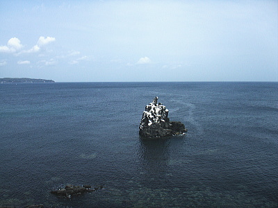 左京鼻から玄武岩を望む(北方向)。白く化粧したように見えるのは実際は鳥のフンらしいです。
