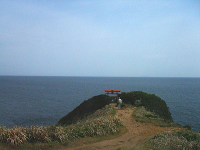 左京鼻の先にある赤い鳥居。ほこらがあります。このあたりは断崖絶壁でダイナミックな景色を眺められます。