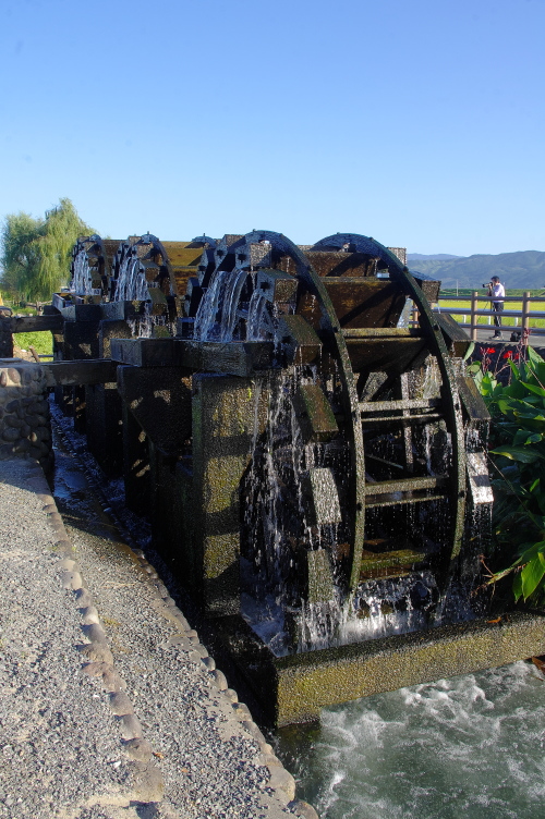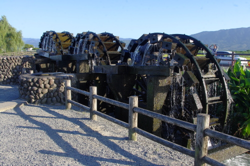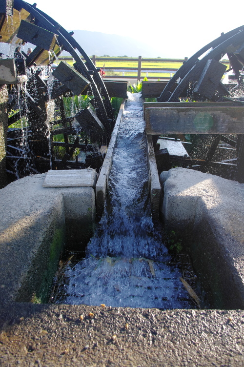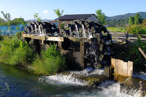 | 菱野三連水車から汲み上げられた水は、用水路に流れていきます。 |