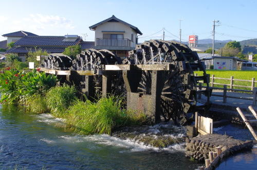 | 朝倉市にある三連水車は、約210年前干ばつにあえぐ朝倉地方の水田に水を引くために、当時の農地灌漑技術を結集して造られたのが、この三連水車です。現在も三連水車1基・二連水車2基により35ヘクタールの農地に水を供給しています。現在稼働する水車の中では日本最古のもので、平成2年に「堀川用水及び朝倉の揚水車」として国の史跡に登録されています。 |