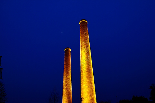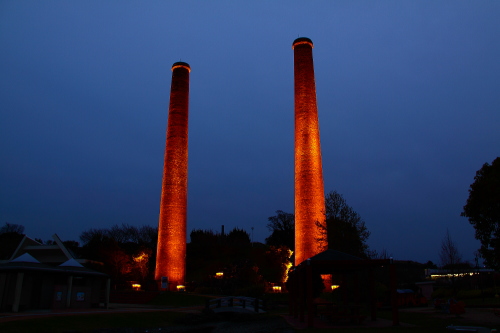 | 日没後の旧三井田川鉱業所 第一・第二煙突ライトアップ。 |