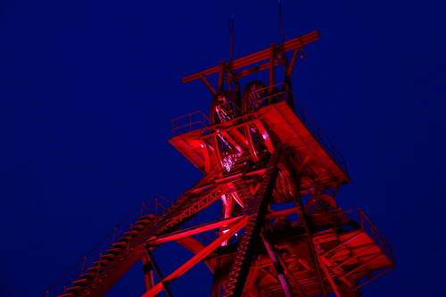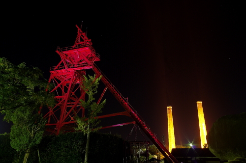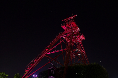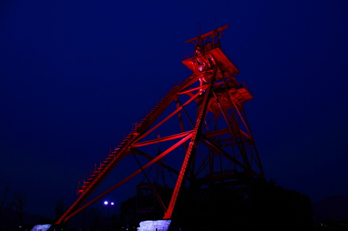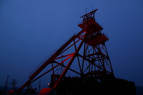 | 日没後の旧三井田川鉱業所伊田竪坑櫓。 |
