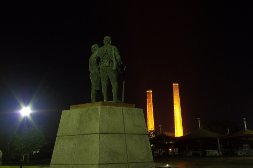 | 銅像と旧三井田川鉱業所 第一・第二煙突ライトアップ。 |