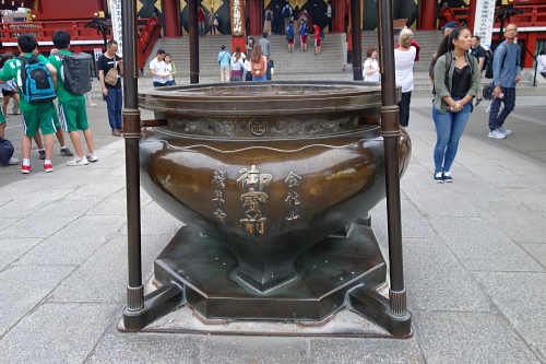 | 本堂前にある常香炉。線香の煙を自分自身にかけます。 |