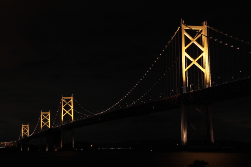 瀬戸大橋記念公園は瀬戸大橋を間近で眺める事ができる公園で、夜間は照明が消灯しているため、懐中電灯があった方がベストです。車で公園の海沿いまで入れますが、深夜は進入禁止になっています。オレンジ糸の照明が照らされた瀬戸大橋は迫力があります。