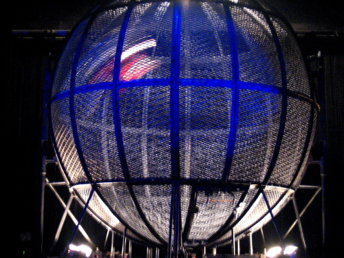 | 上海雑技団。バイクで球体内を走る芸。 |