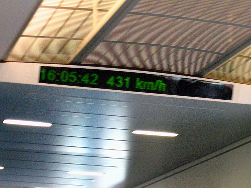 | リニアモーターカーの最高速度表示。431km/h。 |