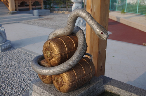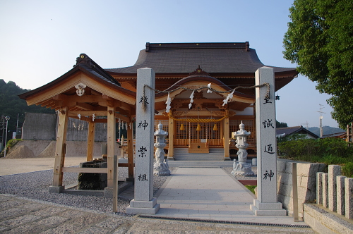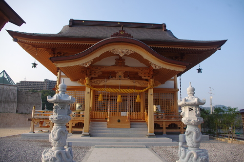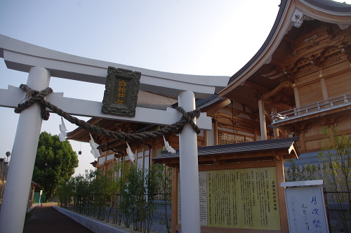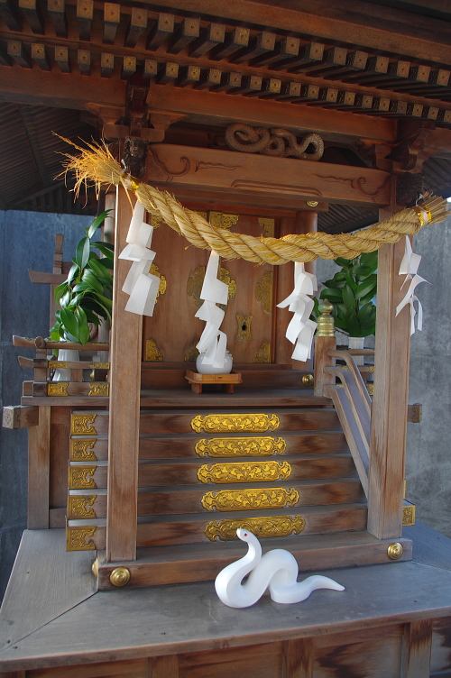 | 白蛇今津観覧所に平成24年11月に新しく建立された白蛇神社は、金運・商売繁盛の神様「宝冠白蛇弁財天」を祀っており、社殿には岩国城がある横山の檜を使用しているようです。また、白蛇資料館も併設されており、白蛇観覧もできます。 |