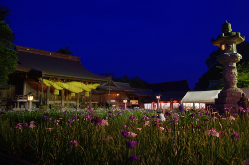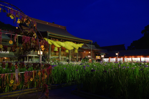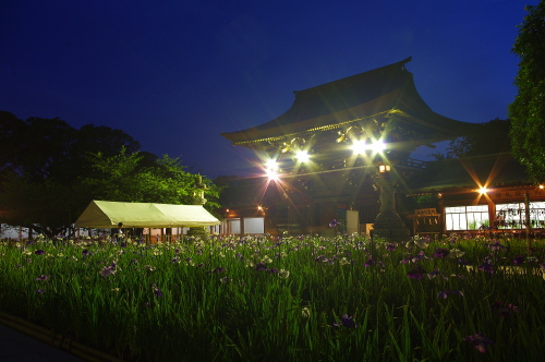 | ライトアップされた菖蒲と御本殿。 |
