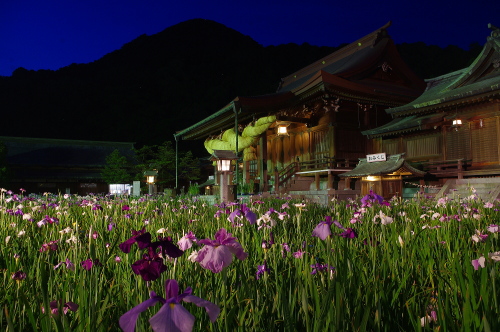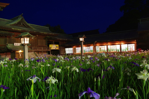 | 福津市にある商売繁盛の神様・宮地嶽神社は宗像大社と並んで参拝客が多い神社で有名な神社です。毎年5月31日からあ6月10日までの期間、江戸菖蒲園と江戸菖蒲を拝殿前に移設し、菖蒲まつりとして訪れる人々の目を楽しませてくれます。夜間はライトアップされ。昼間とは違った雰囲気で楽しむ事ができます。 |