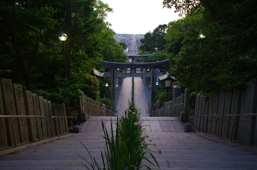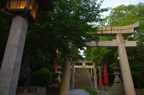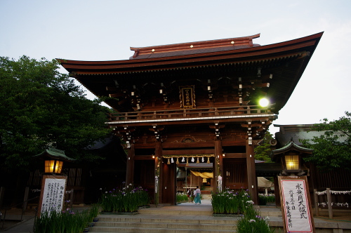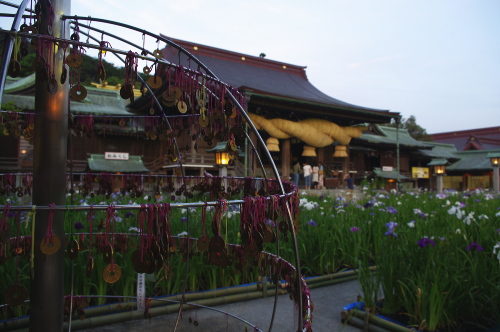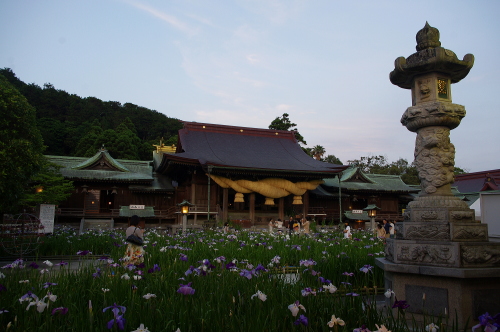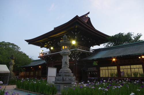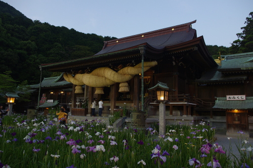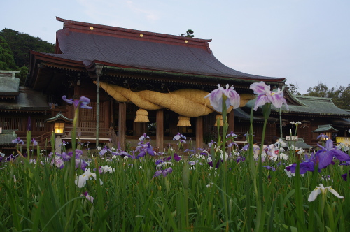 | 福津市にある商売繁盛の神様・宮地嶽神社は宗像大社と並んで参拝客が多い神社で有名な神社です。毎年5月31日から6月10日までの期間、江戸菖蒲園と江戸菖蒲を拝殿前に移設し、菖蒲まつりとして訪れる人々の目を楽しませてくれます。 |