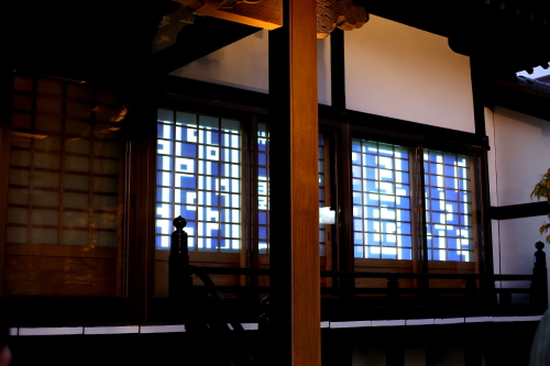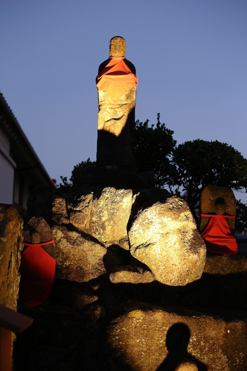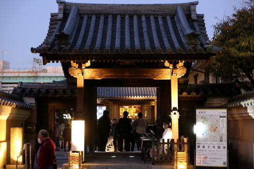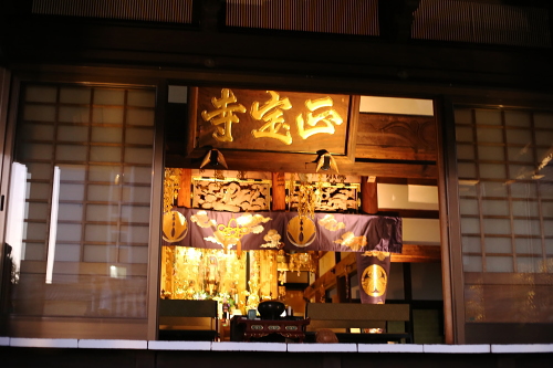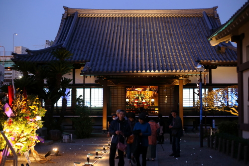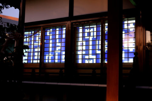 | 正定寺は明応年間(1492〜1501)に開基された寺院で、境内には草月流いけばなが展示されておりライトアップされています。本堂の左右の窓には博多祇園山笠の法被の模様が映像演出されており、見て楽しめるものです。 |
