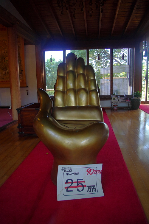 | 岡本太郎作の椅子。「なんでも鑑定団」で鑑定された価格の札が置かれています。 |