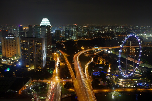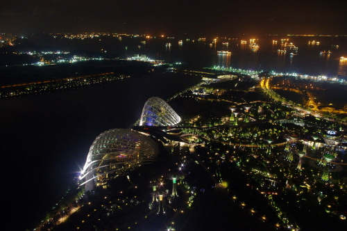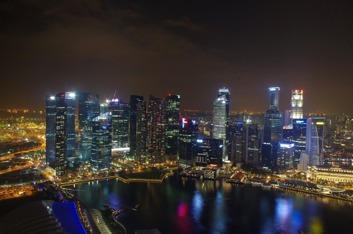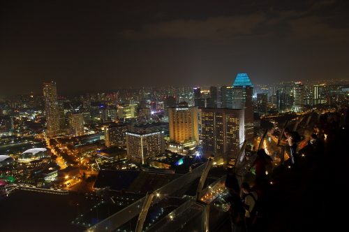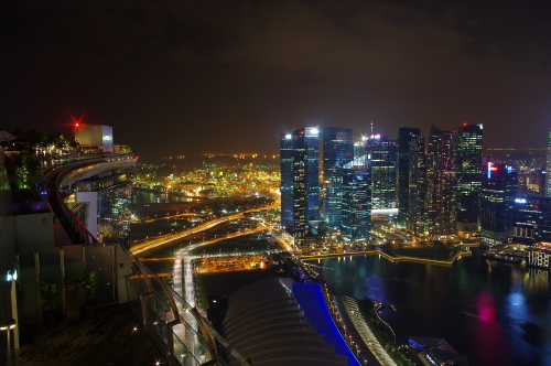 2010年6月にグランドオープンしたマリーナ・ベイ・サンズは、ホテルやショッピングモールなどを兼ね備えた大型複合施設で、地上200mにある最上階の展望台から眺める夜景は非常に美しく、たくさんの観光客が夜景観賞に訪れるスポットになっています。利用料金は大人20S$。三脚使用不可なので夜景撮影はかなり厳しいものがあり、工夫する必要があります。