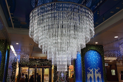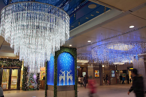 福岡の商業中心地・天神の一角をなすソラリアターミナルビルの1階にあるライオン広場には、満天の星空という青と白のLEDで電飾されています。