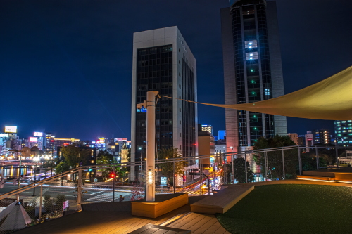 | 最上階展望デッキの雰囲気。大同生命ビル・天神中央公園を望む。 |