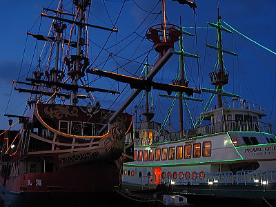 | 電飾された「パールクイーン」と海賊船「海王」。 |