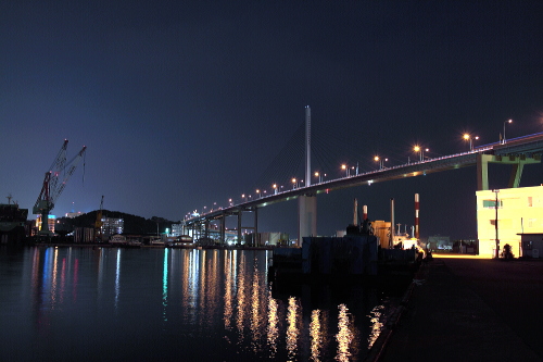 | 天神から車で約5分で到着する手頃な夜景スポットである須崎埠頭からは、荒津大橋を中心とした夜景だけでなく、対馬行きのフェリー乗り場方面からは長浜方面の高層建築マンションなどの夜景を観賞できます。超高層建築物が少ない福岡には珍しい夜景です。 |