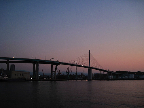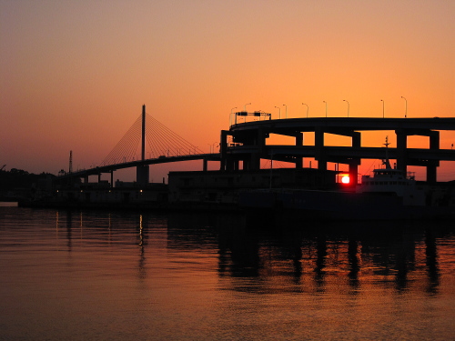 須崎埠頭から沈む夕日と福岡都市高速を望む。