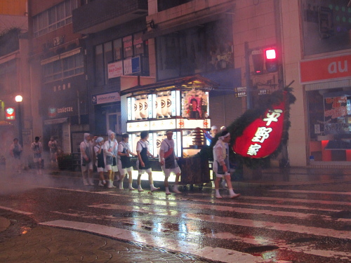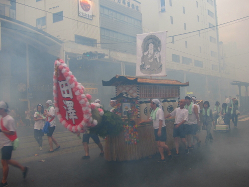 | 精霊流しは長崎市を中心に行われるお盆の行事で、初盆を迎えた故人の家族らが盆提灯や造花等で飾られた精霊船と呼ばれる船を長崎市内を回り、流し場と呼ばれる終着点まで運ぶものです。市内を回る際に爆竹を鳴らすのが特徴的で、周辺は爆竹の煙が充満します。決してお祭りではなく、仏教の行事であることから、いろんな制限等があるようです。 ちなみにこの時期は爆竹の売上が億単位で上がるようで、各家庭でも数百万かけて爆竹を購入するようです。 |