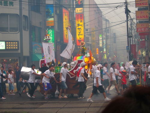 | 爆竹を鳴らしながら長崎市内を回る精霊船。 |