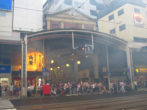 | 浜の町アーケード付近にて精霊船を見る観光客。 |