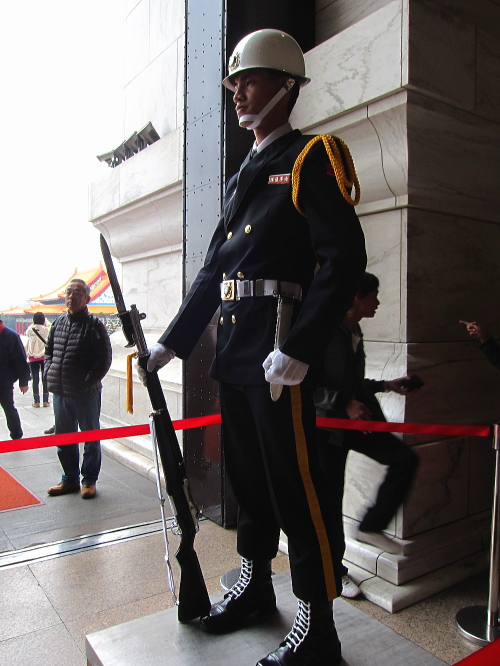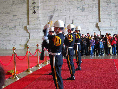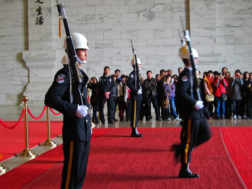 | 中正記念堂は、中華民国初代総統である「蒋介石」を記念した巨大な建築物で、中正記念堂の「中正」とは蒋介石の本名であり、蒋介石に関連するものなどが展示されています。儀仗隊が早朝進駐し、儀仗隊交代式は観光の名物になっています。 |