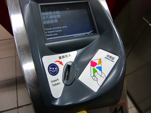 | 駅から出るときは、トークンを投入口に投入するとゲートが開きます。 |