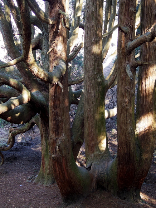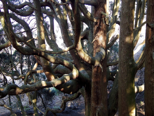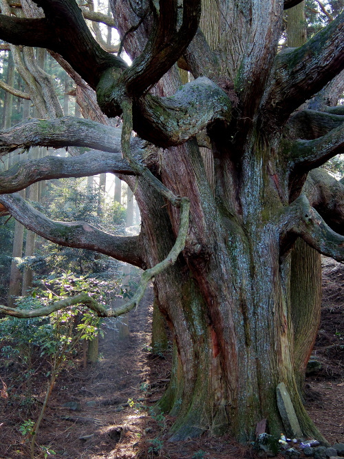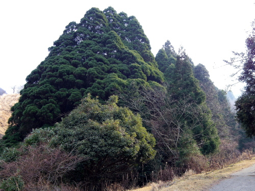 | 国道325号線の高森町村山交差点よりちょっと先から細い道に入り、進んでいくと開けた牧場が見え始めた所から入口があるという分かりにくい場所にある高森殿の杉ですが、車を道路脇の広い場所に止めて牧場のゲートから入って約200mで到着します。この高森殿の杉の1本は、1mの高さから3本に枝分かれしていて伸びており、もう1本は大木な幹から数本伸びており、おどろおどろしい奇妙な形をした大杉です。天正14年に島津勢に敗れた高森城主伊予守惟直と家臣三森兵庫守能因が、ここで自刃したとされています。 |